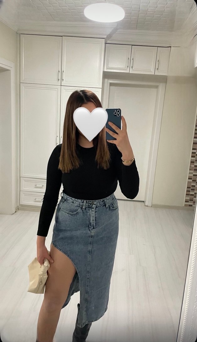 Siyah, normal boy, yan yırtmaç detaylı, kot kumaştan yapılmış, günlük kullanıma uygun, rahat ve şık kadın etek.