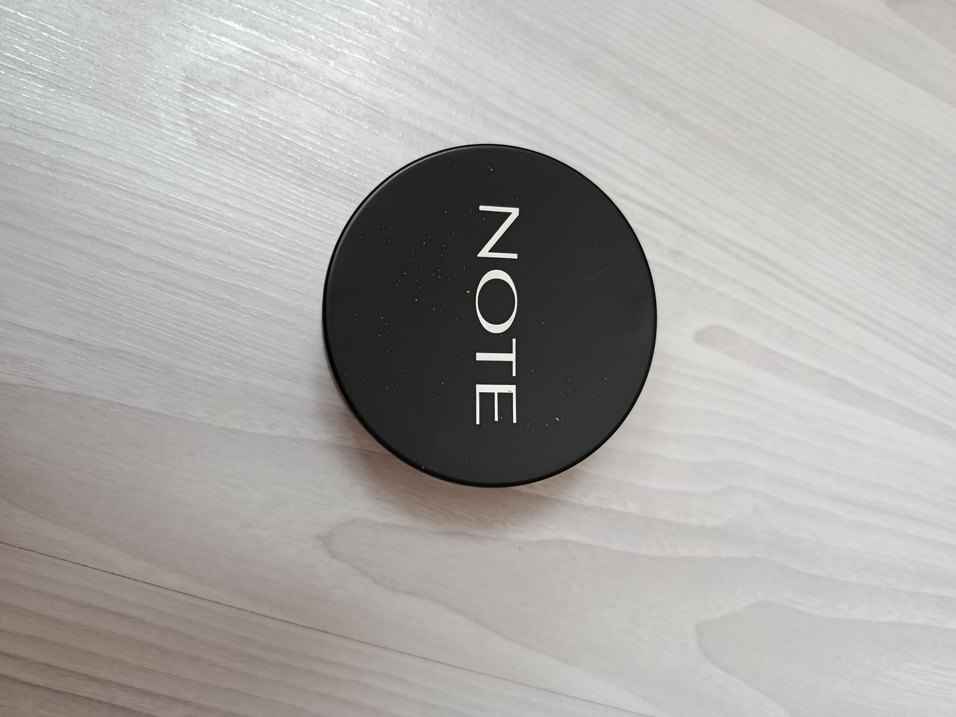Note markasına ait siyah kompakt pudra, yuvarlak şık kutuda. Makyaj sabitleme ve tazeleme için uygun.