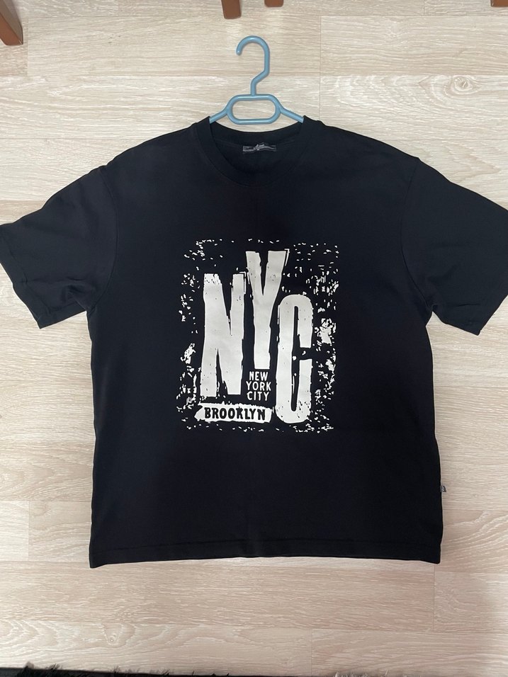 Siyah renkli, baskılı NYC ve Brooklyn desenli, kısa kollu, bol kesim erkek tişörtü. günlük kullanıma uygun, normal boyda bir ürün. M bedendir. Hiç giyilmemiştir.