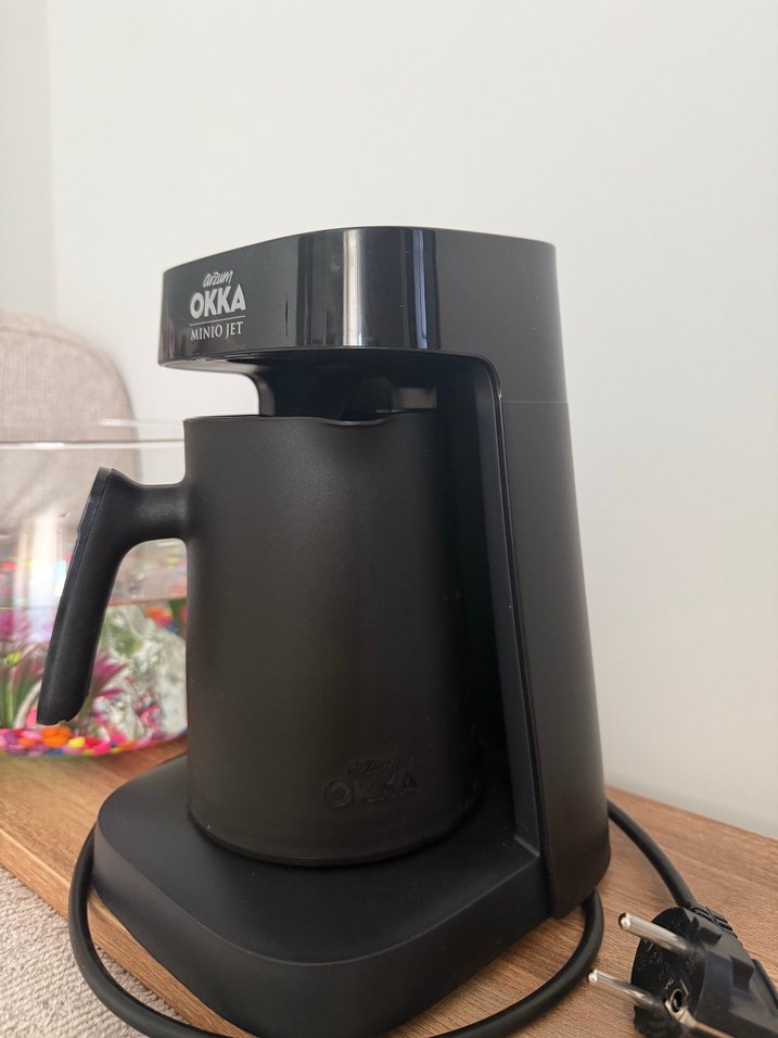 Siyah OKKA Mini Jet kahve makinesi, hediye geldi deneme amaçlı bir defa kullanıldı performans ürünü 5 fincan kahve tam alıyor Faturası var sadece kutusu yok