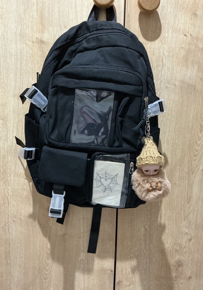 Okul için çanta Çok bölmeli ve yan tokalı siyah çocuk okul sırt çantası, örümcek ağı desenli şeffaf cep ve oyuncak bebek aksesuarı içerir.