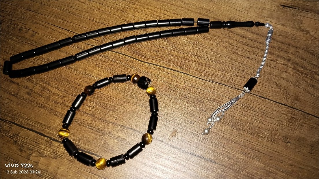 siyah renkte Oltu taşından erkek tespih ve bileklik seti