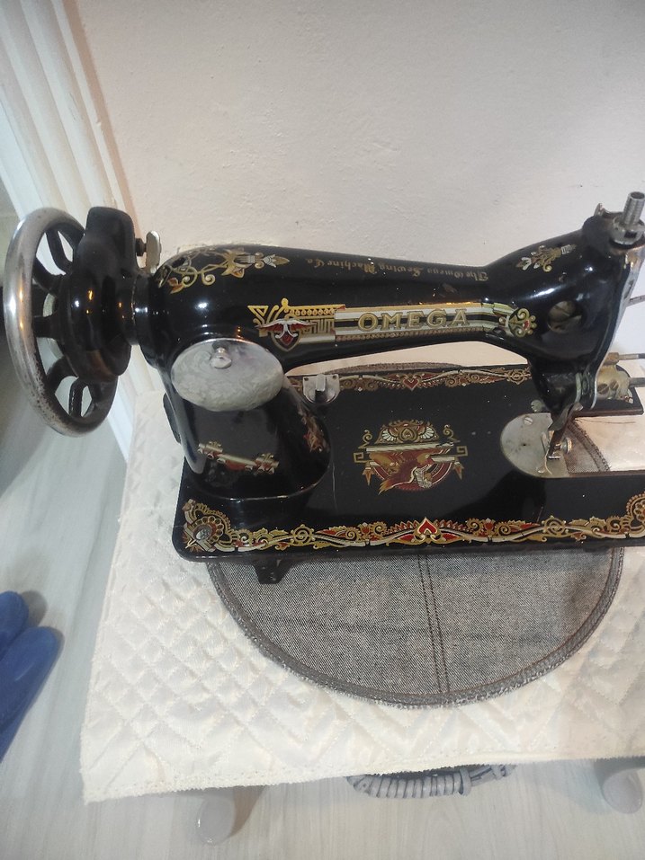 Siyah Omega dikiş makinesi, altın süslemeler ve eski tarz el çevirmeli mekanizmaya sahiptir. çalışmıyor sade aksesuar olarak kullanılır bilginize