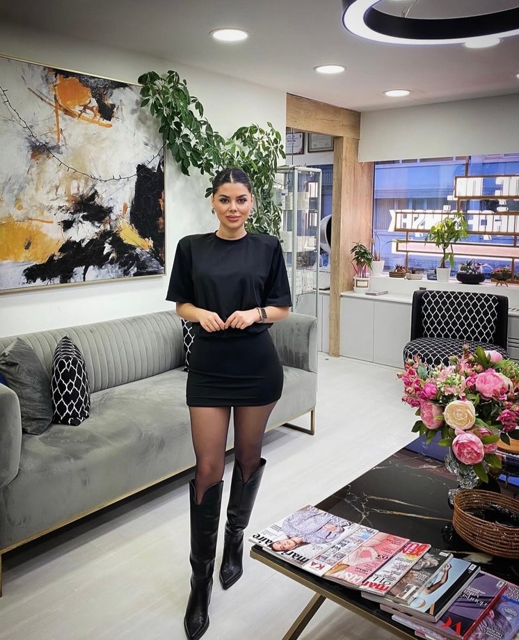 Kısa kollu, bisiklet yaka ve siyah mini elbise, sokak stiline uygun şık ve rahat bir tercihtir.