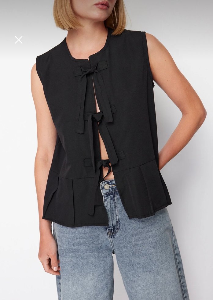 Siyah önden bağlamalı Kolsuz bluz Önden bağlama detaylarıyla rahat ve şık bir görünüm sunar, günlük kullanıma uygundur.