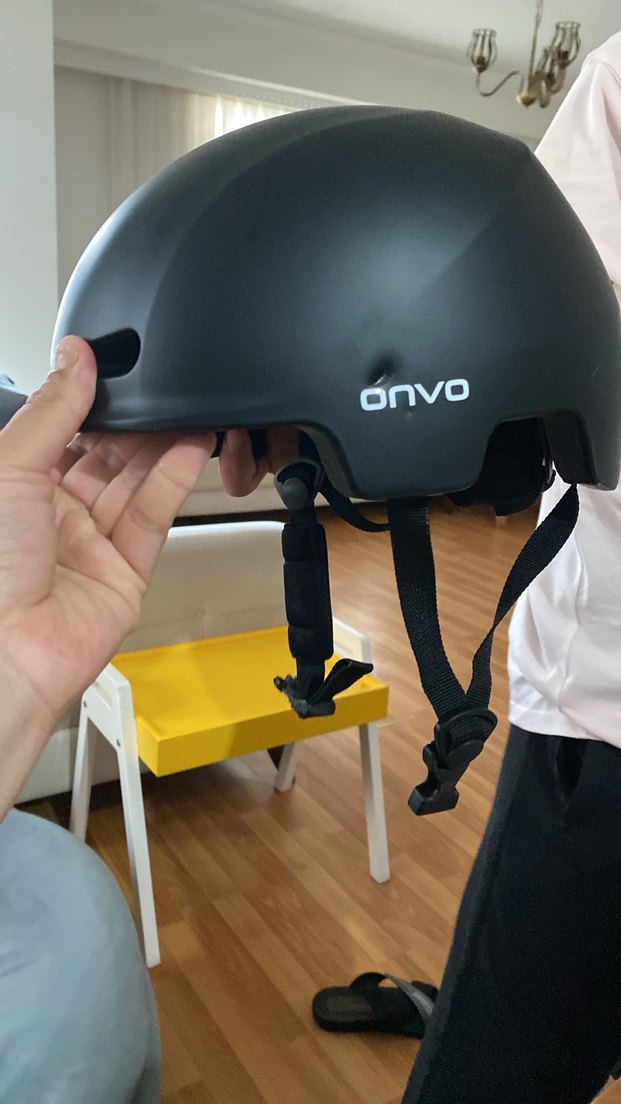 Velcro bantlı, baskılı siyah plastik motosiklet kaskı. Onvo logosu ve rock punk havası taşıyan biker tarzı. ️