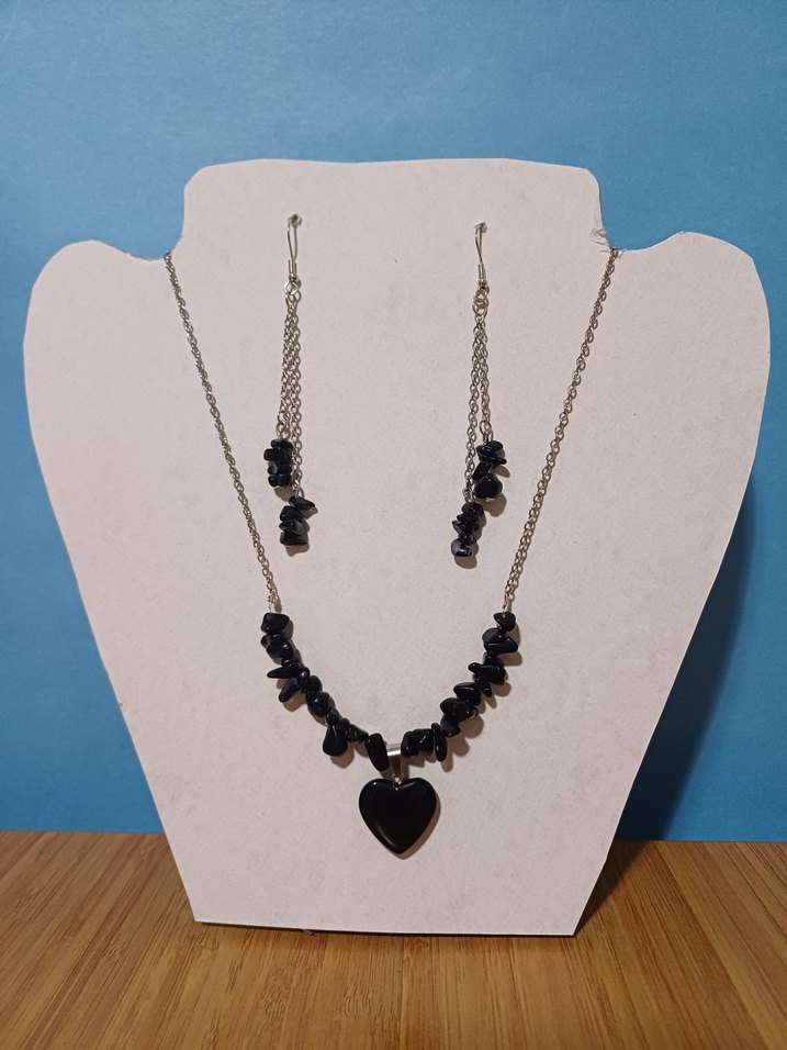 Siyah opsidyen gotik kolye seti, kalp figürlü kolye ve uyumlu küpelerden oluşur. Bohem ve retro tarz için uygundur.