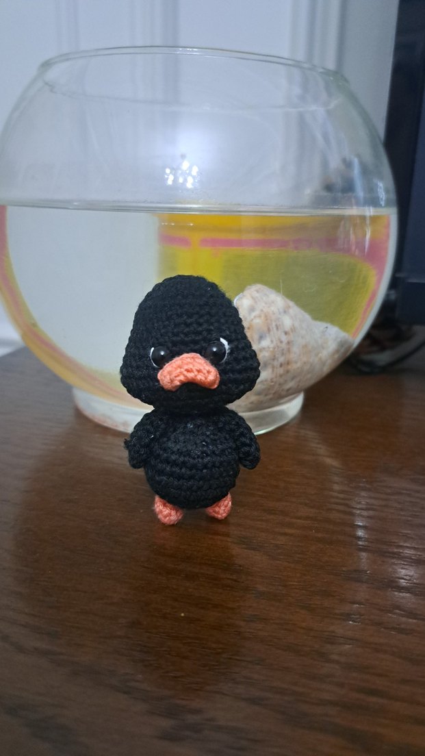 El yapımı siyah ördek anahtarlık, yumuşak dokusu ve turuncu gagası ile dikkat çeker. Küçük ve sevimli bir dekorasyon veya anahtarlık olarak kullanılabilir.