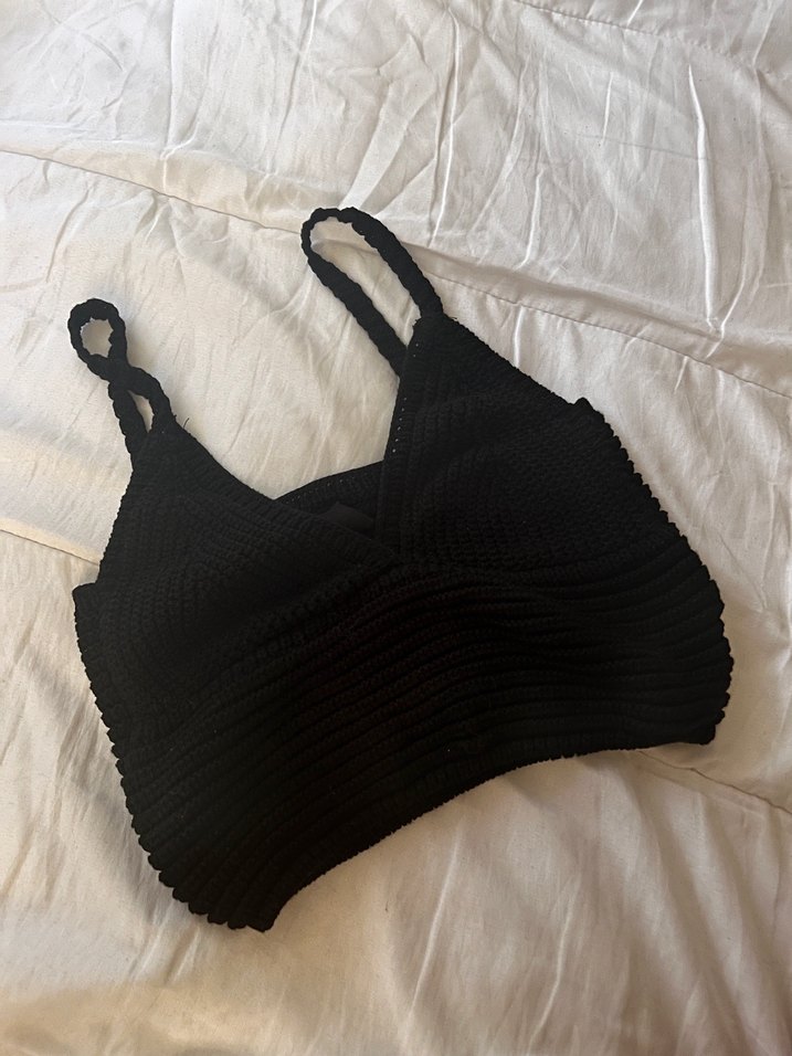 Fitted kesim siyah örme büstiyer, askılı kollu ve kayık yaka detaylı, rahat tarzda günlük kullanım için uygundur. S-m beden