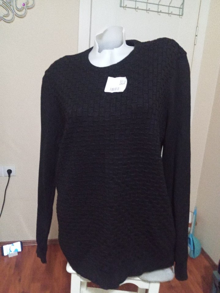 Siyah örgü kazak, yuvarlak yaka ve uzun kolludur. Normal kesim, sade ve rahat günlük kullanım için uygundur.