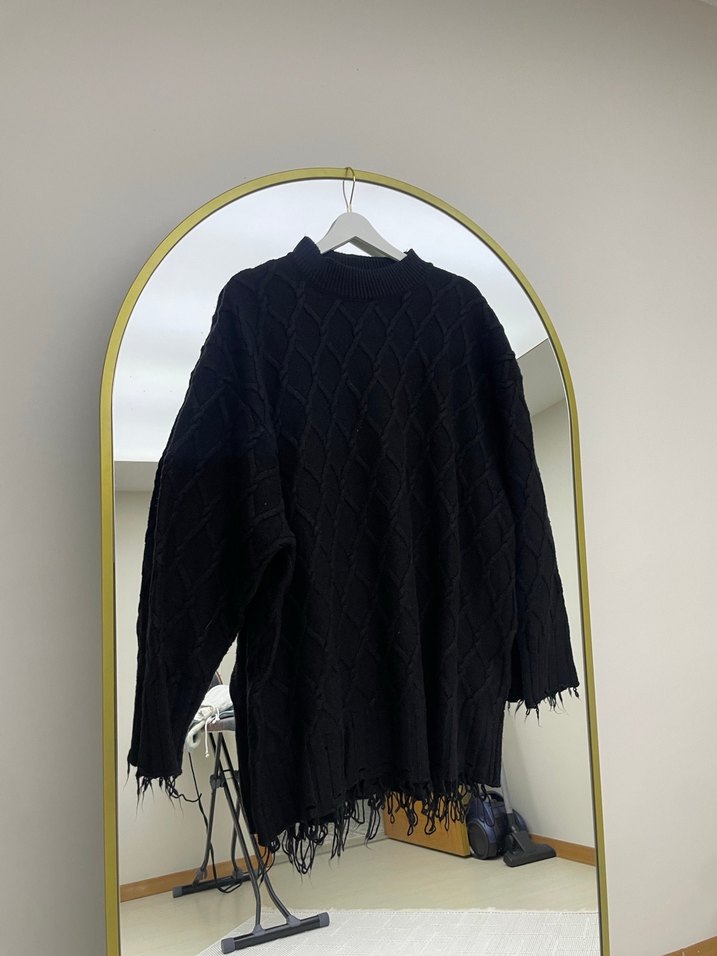 Siyah örgü kumaştan, boğazlı ve uzun kollu, bol kesim midi uzunlukta kadın kazak. Sokak stiline uygun ve günlük kullanıma rahat bir parça.