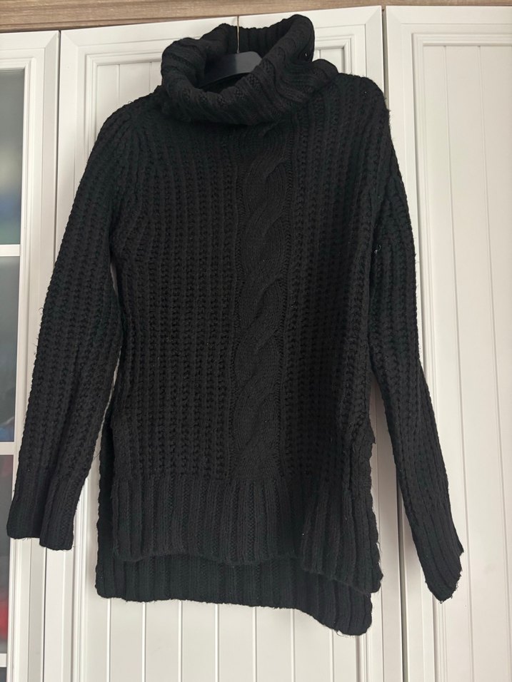 Siyah örgü kadın kazağı, boğazlı, uzun kollu ve rahat kesimlidir. Midi uzunlukta ve desen içermeyen günlük kullanıma uygundur.