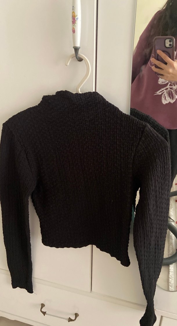 Siyah, örgü, boğazlı ve uzun kollu bu dar kesim kazak, gündelik kullanıma uygun rahat ve şık bir tarza sahiptir.