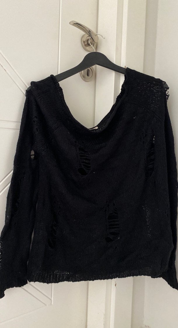 Siyah örgü kumaştan, boğaz yaka ve uzun kollu, bol kesim kadın kazak. Gotik tarzıyla günlük kullanıma uygundur.