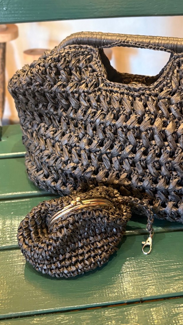 Siyah örgü bohem tarzda kadın çanta ve uyumlu küçük cüzdan, yumuşak örgü kumaştan yapılmıştır, günlük kullanım için uygundur. Mango model deri tabanlı