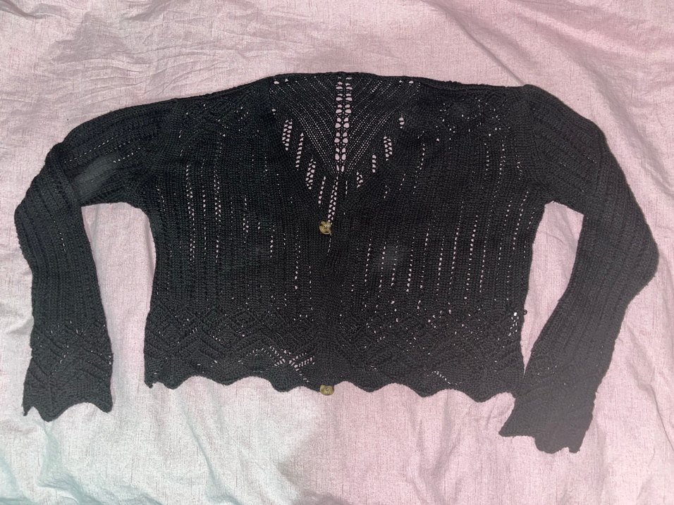 Siyah renkli, örgü yapıda bohem tarzda kadın ceketi Rahat ve detaylı örme deseni ile retro ve hippie stillere uygundur.