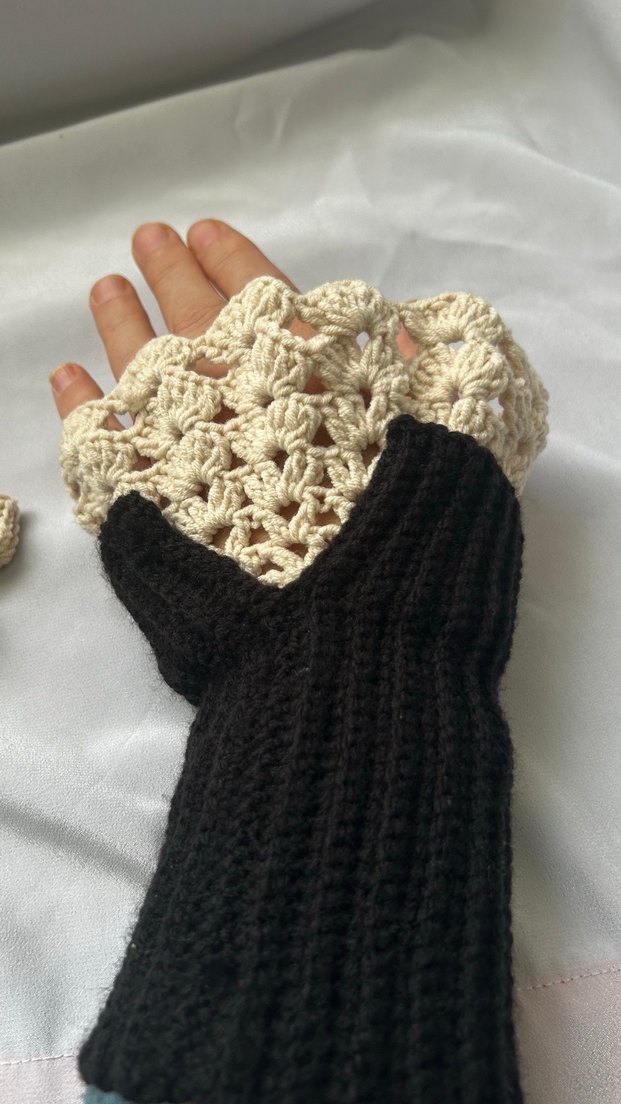 Siyah örgü kadın eldiveni, bohem tarzı ve retro hippie görünümü için rahat ve detaylı örme desenlere sahip. Şipariş ile örülür istenen renkte