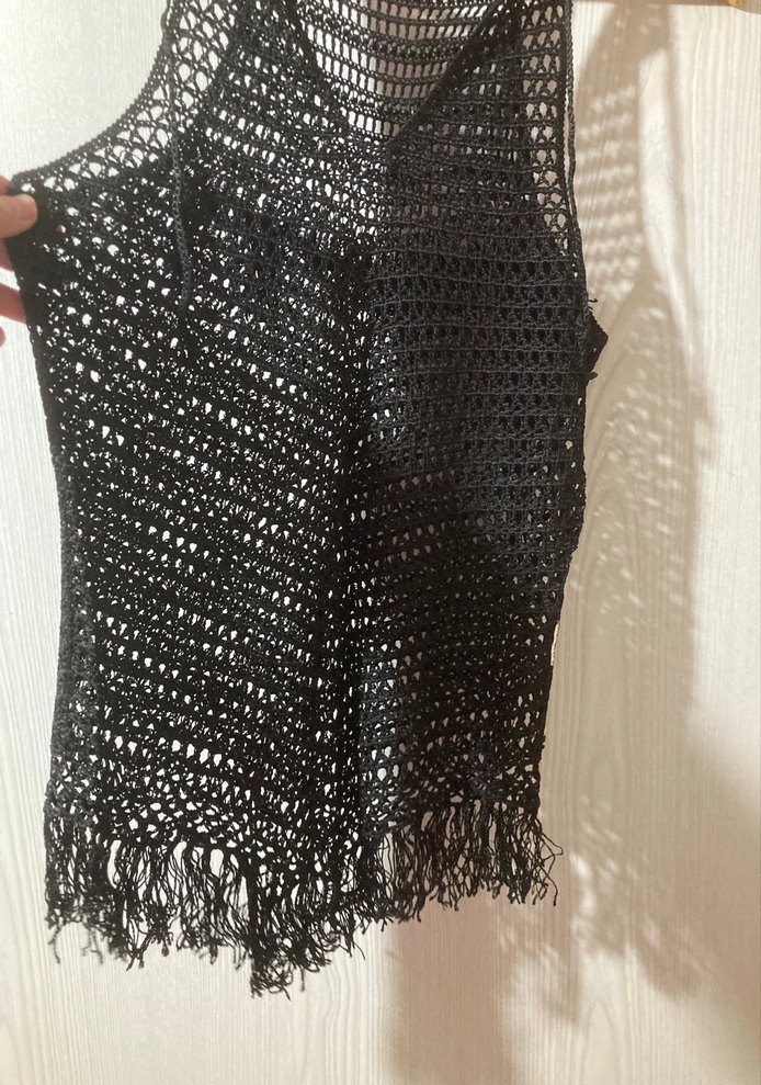 Siyah örgü bohem tarzı, açık dokuma ve püsküllü kenarlarıyla retro veya hippie görünüme uygun kadın şalı.
