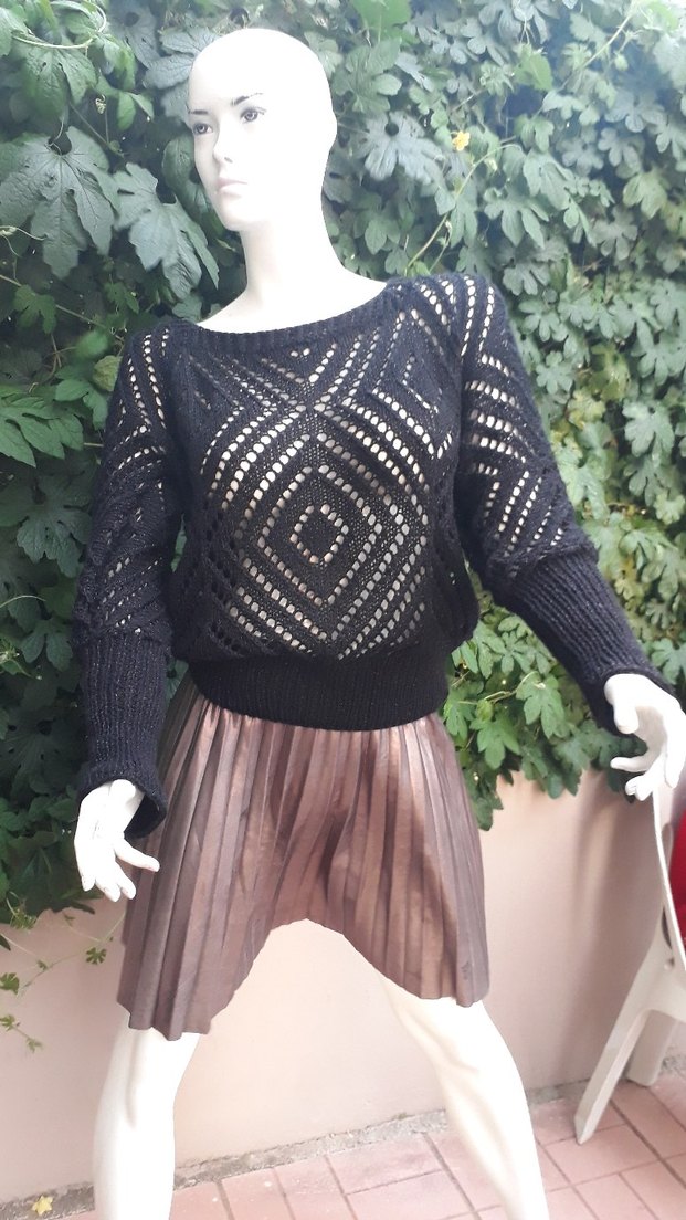 Bu siyah örgü kazak, uzun kollu ve geniş kayık yakalıdır. Bele oturan, geniş ve açık örgü deseniyle bohem goth tarzı sunar. Rahat ve günlük kullanıma uygundur. Rahat kesim kazak L, M ve S bedene uygundur. Manken S beden uyumludur. Ören Bayan Star simli siyah iple örülmüştür. Çekim, ışık ve açı dolayısıyla renk yanılgıları olabilir. Buharda ütü uygulanmıştır. İstenilen renklerde ve ebatta örülür. Sipariş alınır. İnternette görüp beğendiğiniz bir model varsa iletişime geçip onu da ördürebilirsiniz. İADE VE DEĞİŞİM KABUL ETMİYORUM. #coton #cotton #koton #baby #crop #büstiyer #bistüer #bluz #askılı #örgü #orgu #hand #made #el #yapım #motif #pamuk #merserize #akrilik #bohem