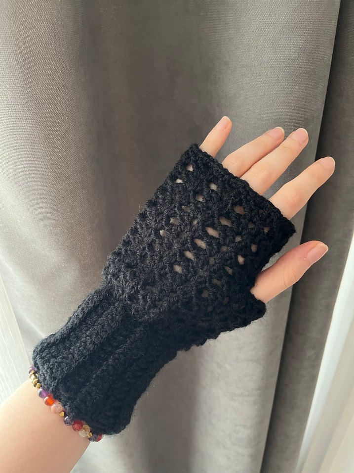 Siyah örgü, parmaksız eldivenler; bohem ve hippie tarzlara uygun, rahat ve retro bir görünüm sunar. Yumuşak örme kumaş sıcaklık ve konfor sağlar.