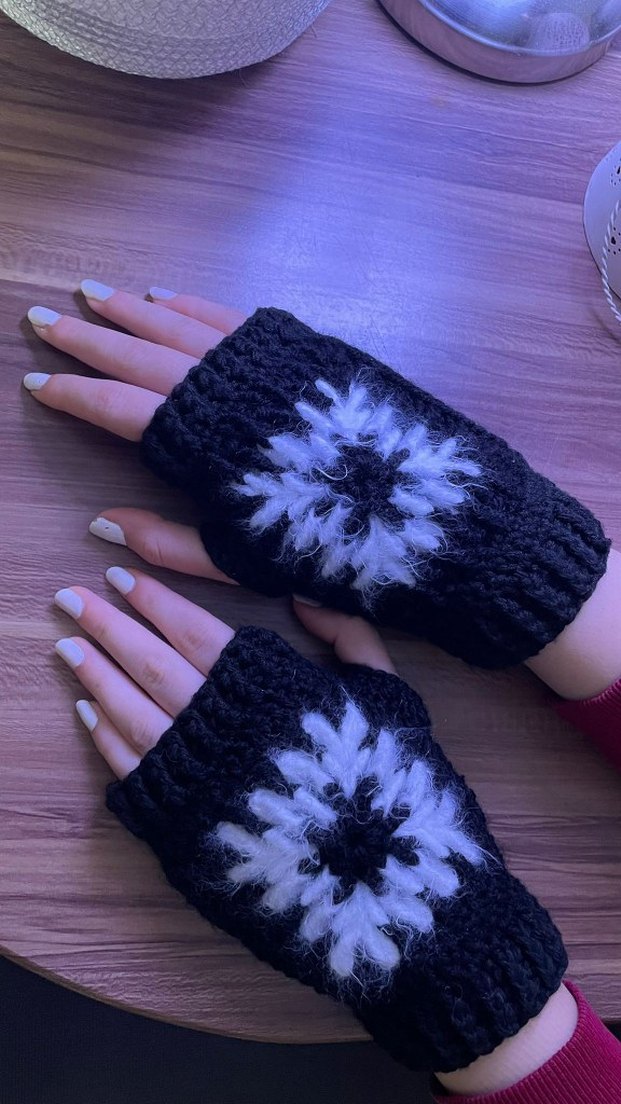 Siyah örgü, beyaz çiçek desenli, parmakları açık bohem ve gotik tarzda eldivenler.