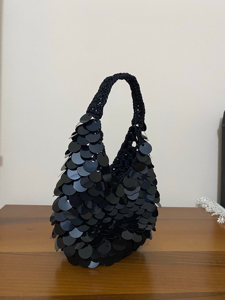 Siyah örgü kumaştan yapılmış, boncuklu ve koyu yılan deseni detaylı gotik çanta. Parti için uygun.
