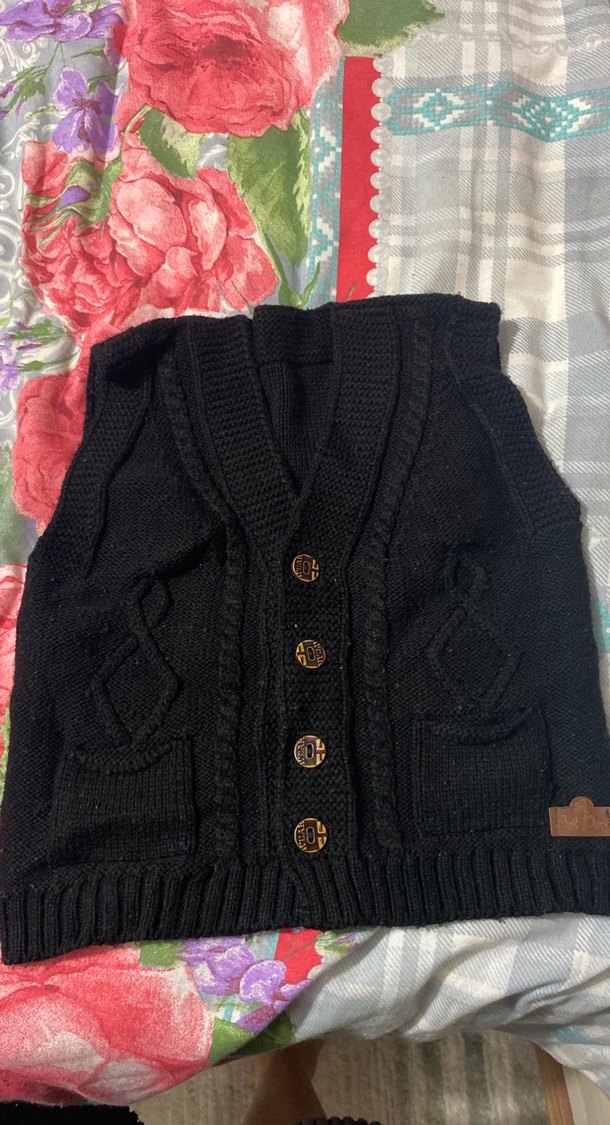 Siyah örgü çocuk süveter, düğmeli kapama ve ön ceplerle tasarlanmış, günlük sokak stiline uygun rahat bir parçadır.