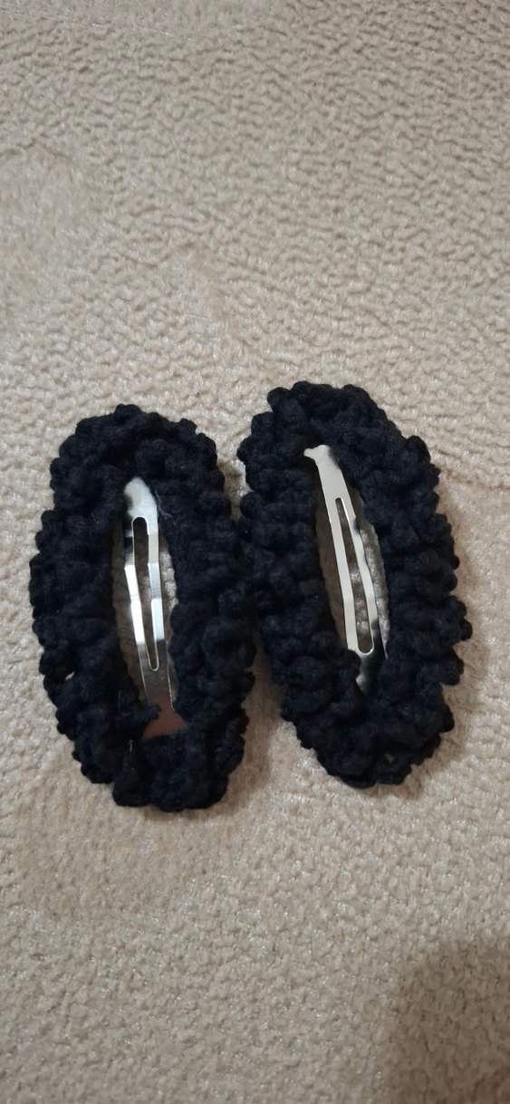 Siyah örgü dokusuna sahip, desensiz çocuk tokaları. Basit goth tarzında, sade ve koyu renkte tasarlanmıştır.
