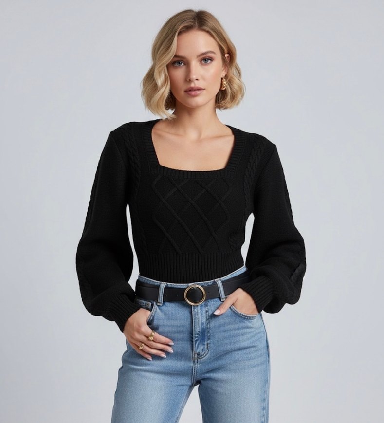 Siyah örgü crop kazak, kare yaka ve uzun kollu, bel kısmı dar kesimle günlük sokak stiline uygun.
