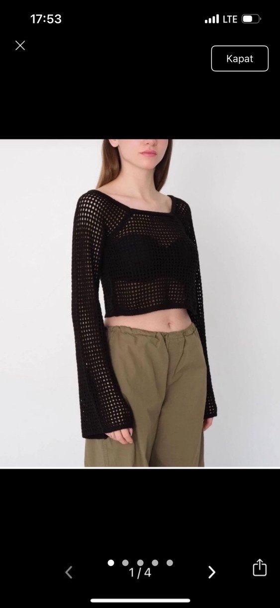 Siyah, uzun kollu ve salaş kesim örgü crop kazak. Yuvarlak yaka ve açık örgü deseniyle günlük sokak stiline uygun.