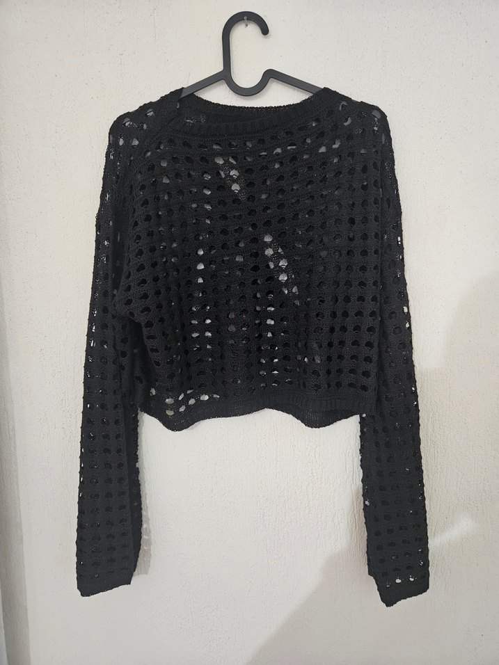 Siyah Örgü Delikli İspanyol Kol Crop Kazak Bluz elbise set . Trendy ve rahat gotik tarzda, delikli örgü deseniyle öne çıkar.
