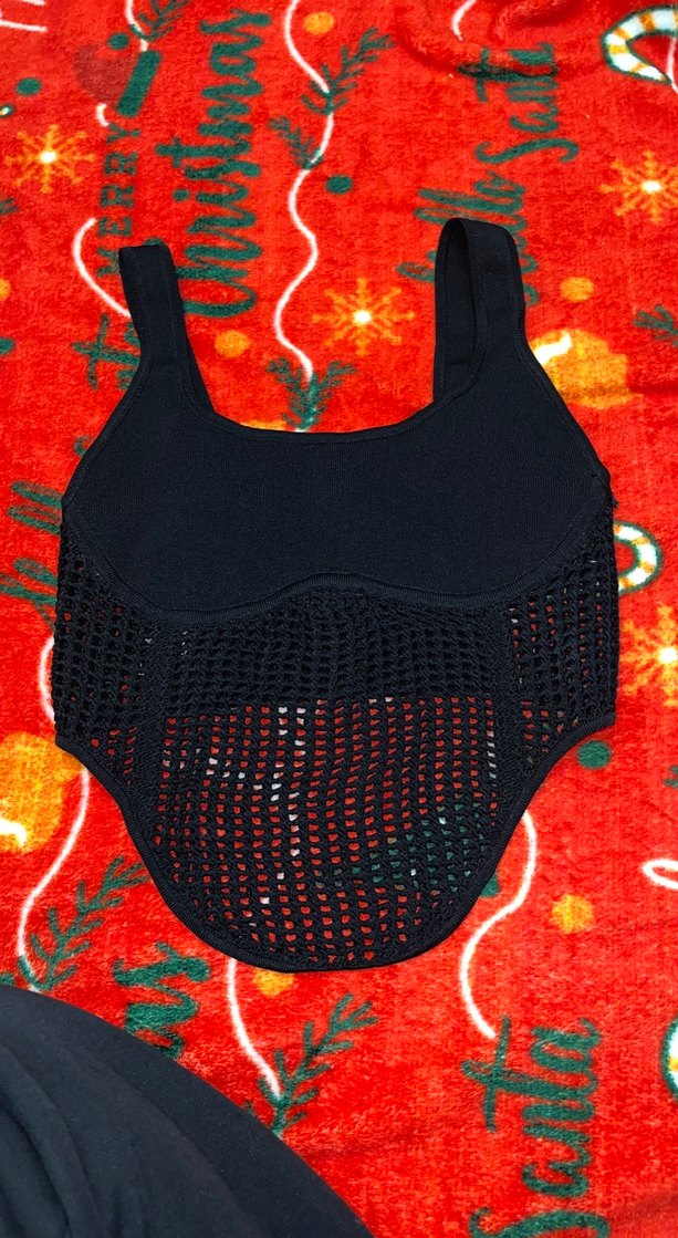 Siyah, düz üst kısmı ve nefes alabilir örgü alt kısmı olan rahat ve kullanışlıdır.