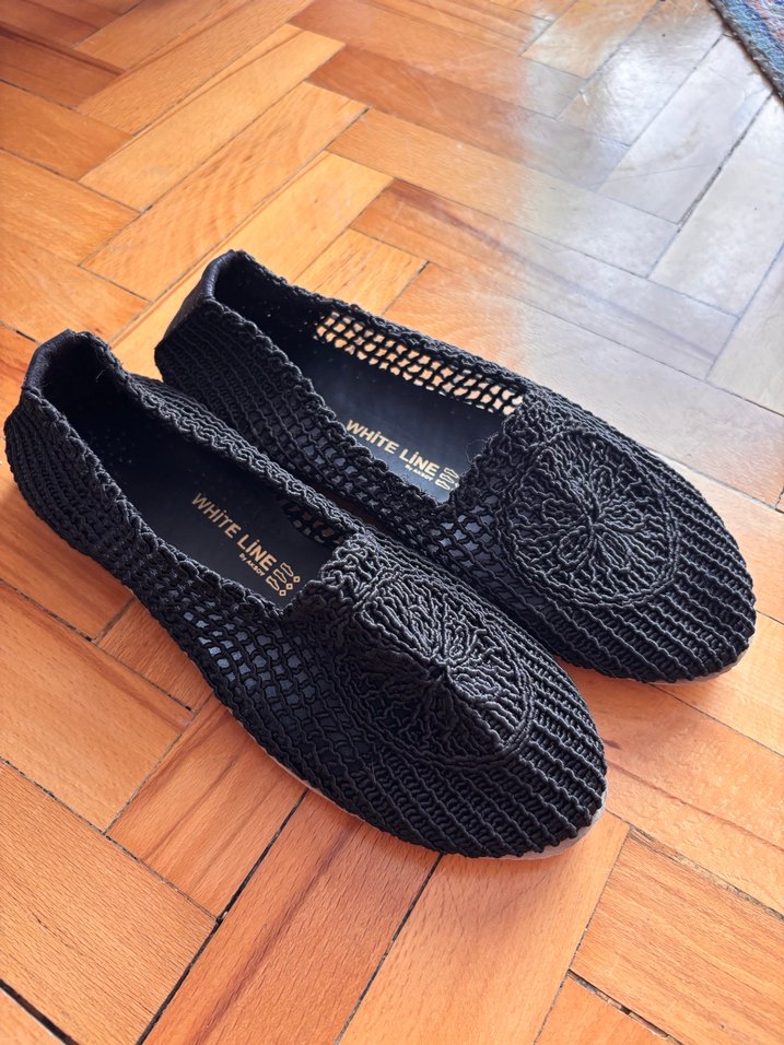 Siyah, örgü ve nakış detaylı kadın espadril. Blok topuklu ve kauçuk tabanlı, günlük şıklık için uygun. Bursa Aksoy ayakkabıdan alındı çok rahattır