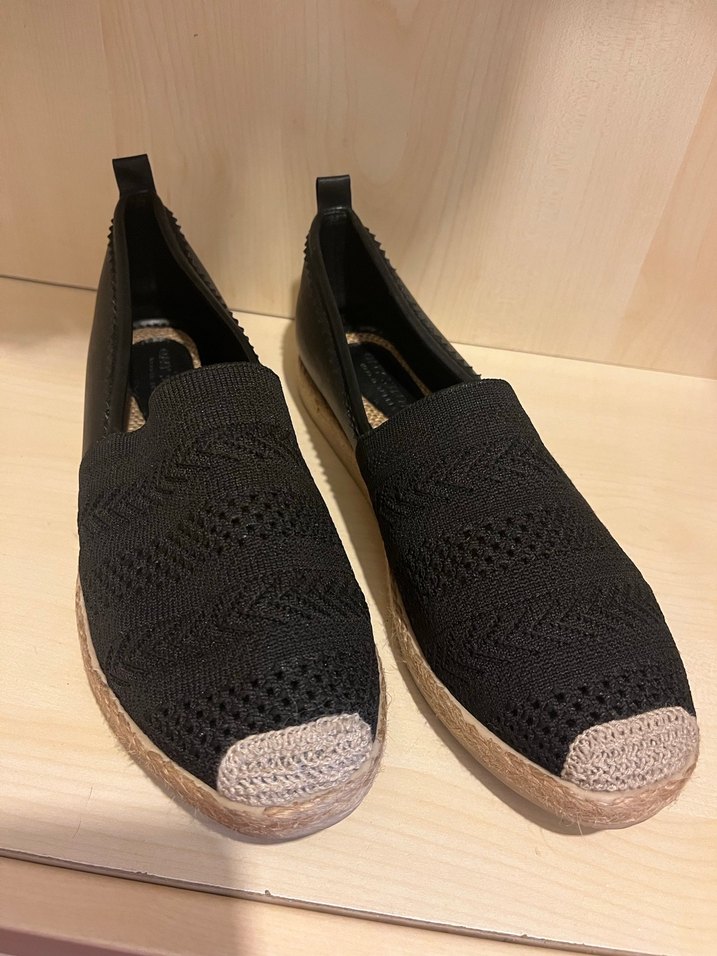 Siyah örgü üst yüzeyi ve arka tabanı deri, günlük kullanıma uygun modern tarzda kadın espadril.