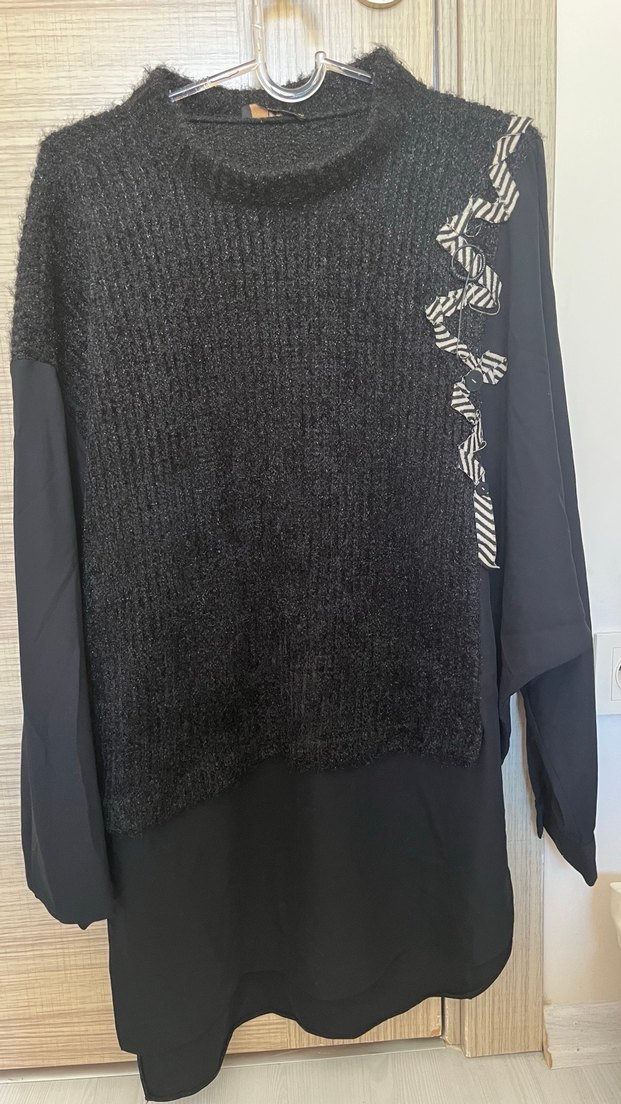 Siyah örgü detaylı kadın triko, bol kesim, uzun kollu ve yuvarlak yaka. Normal midi boyda ve yan tarafında çizgili kurdele detayı bulunur. Günlük kullanıma uygun.