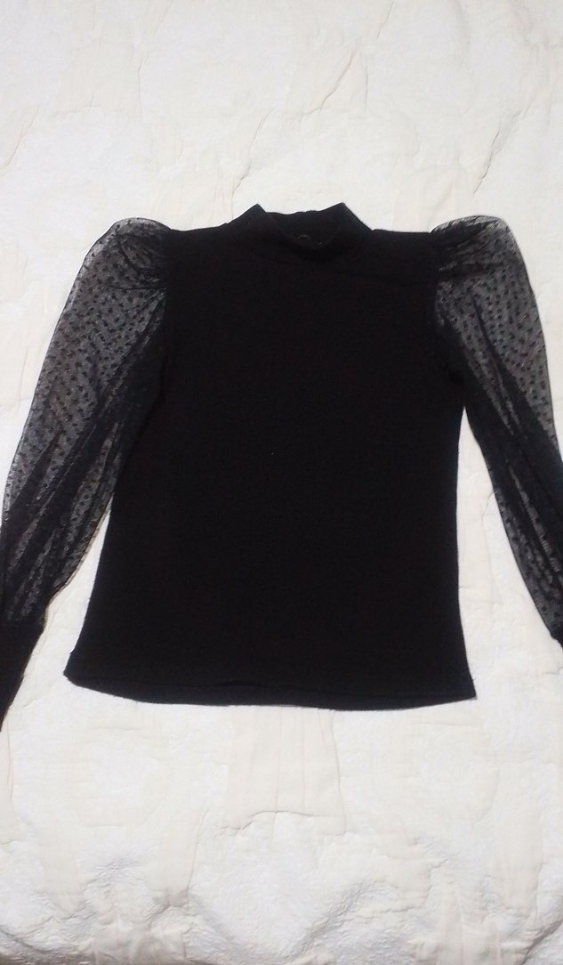 Siyah, balıkçı yaka, örgü detaylı ve transparan uzun kollu dar kesim bluz, gotik tarz için uygundur.