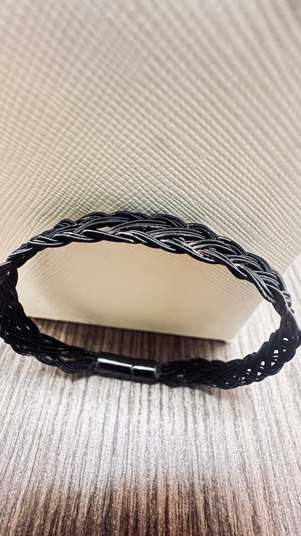 Tamamen el işçiliği ilesiyah bakır ışıltılı kazaziye teli yapılmış, minimalist tarza sahip erkek bileklik. Kolay takma için manyetik kapama bulunur.