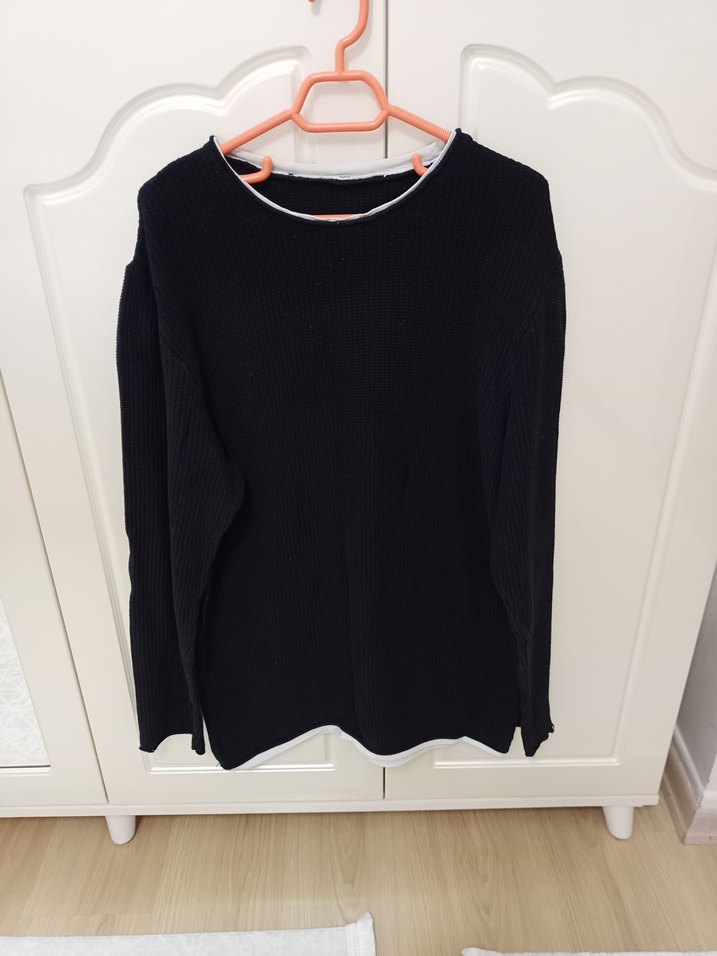 Siyah renkli, örgü dokulu, uzun kollu ve yuvarlak yakalı kadın kazak. Salaş kesimi ve midi boy uzunluğu ile minimalist ve trend görünüme uygundur.