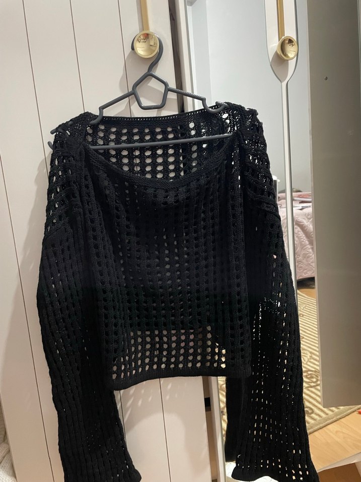 Siyah örgü triko, uzun kollu ve salaş kesimle, tekne yaka ve midi boyda. Gotik tarzıyla günlük kullanıma uygun, modayı takip edenler için ideal.