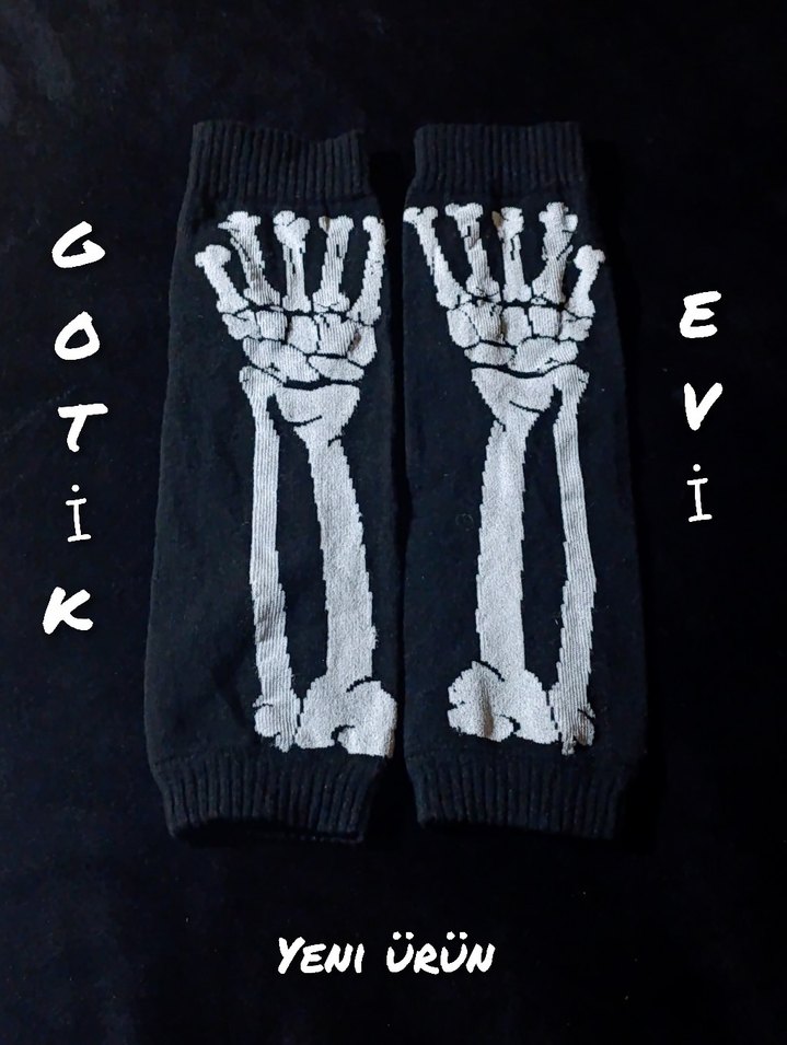 Yumuşak örgü kumaştan yapılmış, gotik iskelet desenli siyah eldivenler. Rock punk tarzına uygun şık bir seçim.