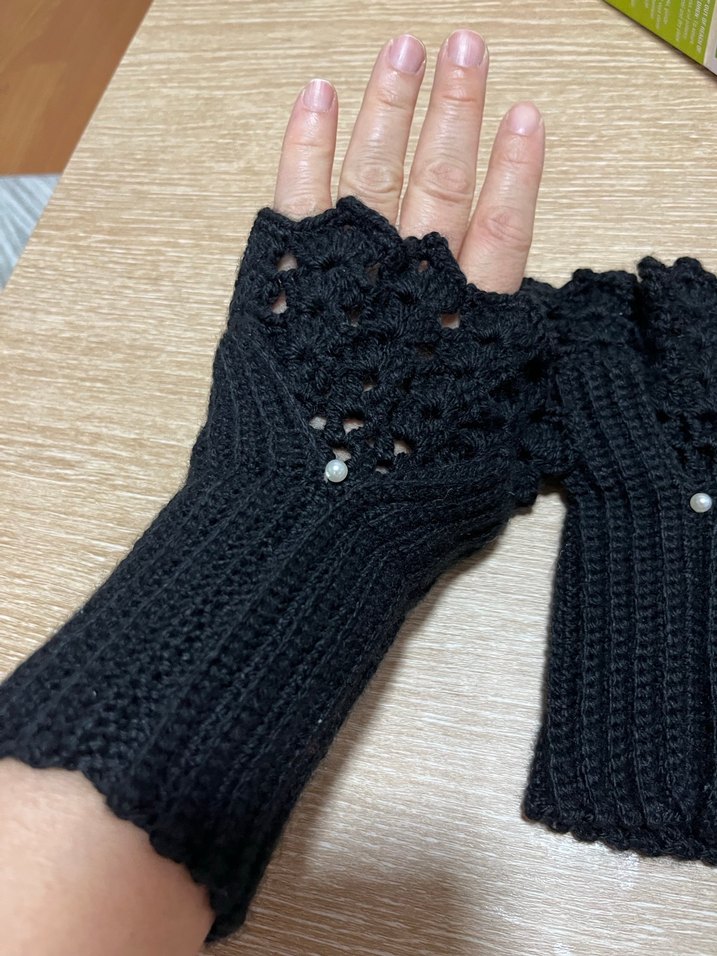 Siyah örgü, gotik tarzda kadın eldivenleri, rahat ve vintage görünümlü, ince delikli desenlere sahip.