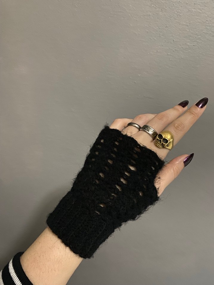 Siyah örgü, parmakları açık gotik tarzda kadın eldiveni. Yumuşak örme kumaştan rock punk havası taşıyor. İsteğe göre başka renklerde de örebilirim. Ayrıca üste bir sıra daha örüp uzatabilirim
