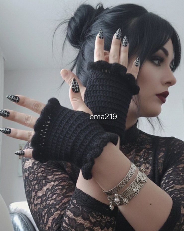 GÖRSEL BANA AİTTİR ✔️ İLAN AÇIYORUM Siyah örgü, parmakları açık gotik tarzda kadın eldivenleri. Rock punk havası veren dokulu bir görünüm sunar. ✨️