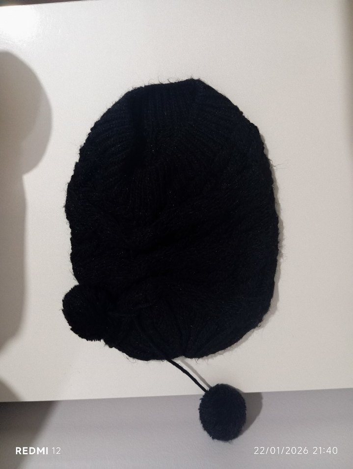 Siyah örgü kadın bere, yumuşak polar kumaş ve ponpon detayıyla rahat ve gotik tarzda bir görünüm sunar.