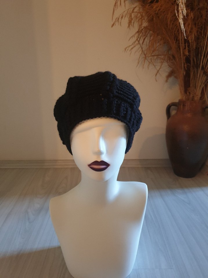 Siyah renkli, örgü dokulu kadın bere, rahat ve gotik tarzıyla trendsetterlar için avant-garde bir görünüm sunar.