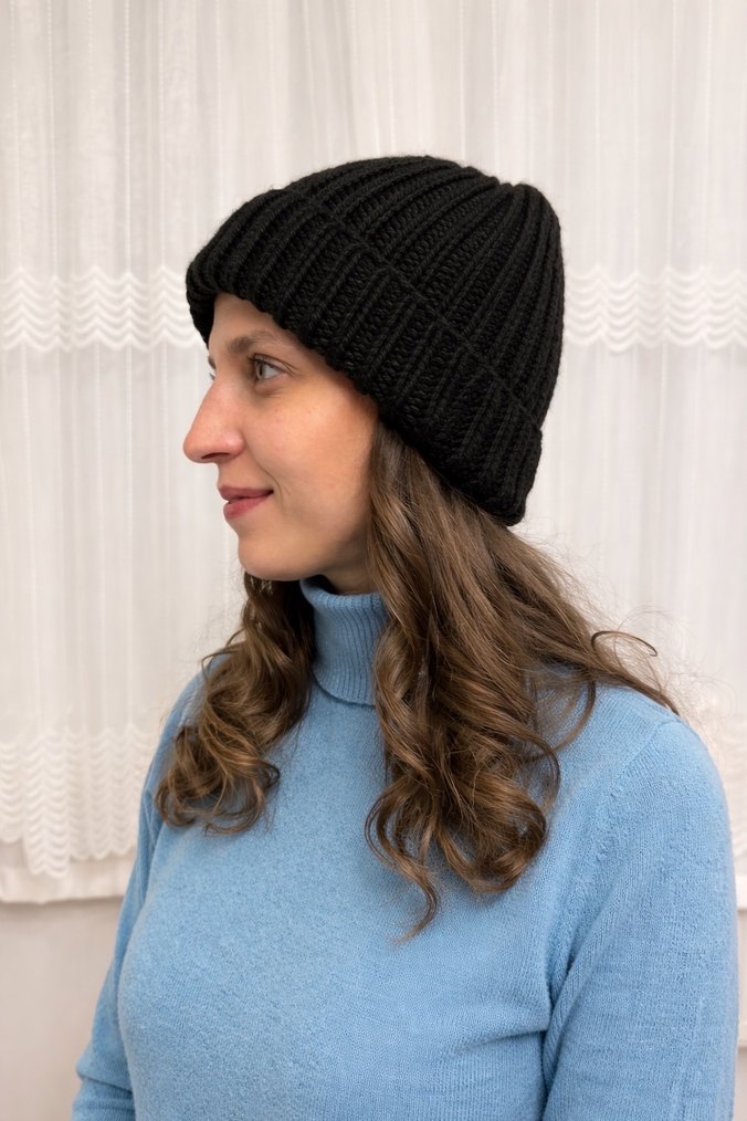 Kadınlar için siyah, örgü örme kumaştan yapılmış, sade ve rahat sokak stili bere.