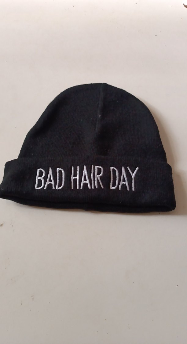 Siyah örgü yünden yapılmış bu kadın bere, manşetinde 'BAD HAIR DAY' yazısıyla rahat ve gotik-punk tarzını birleştirir.
