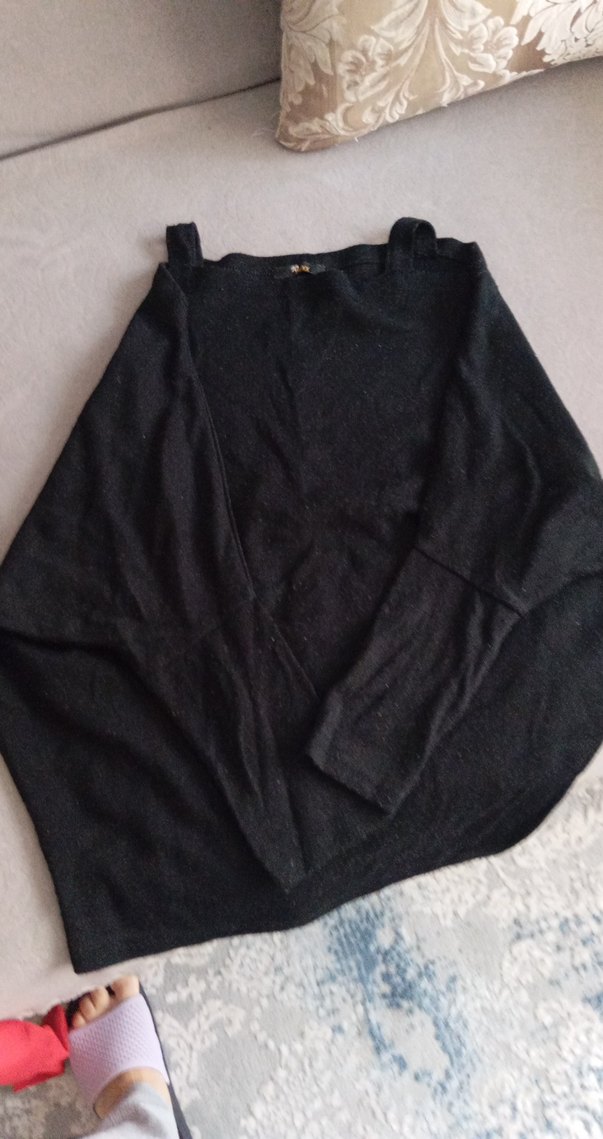 Siyah örgü kadın kazak, boğazlı ve uzun kolludur. Yün malzemeden üretilmiş, rahat ve salaş kesimlidir, günlük kullanıma uygundur.