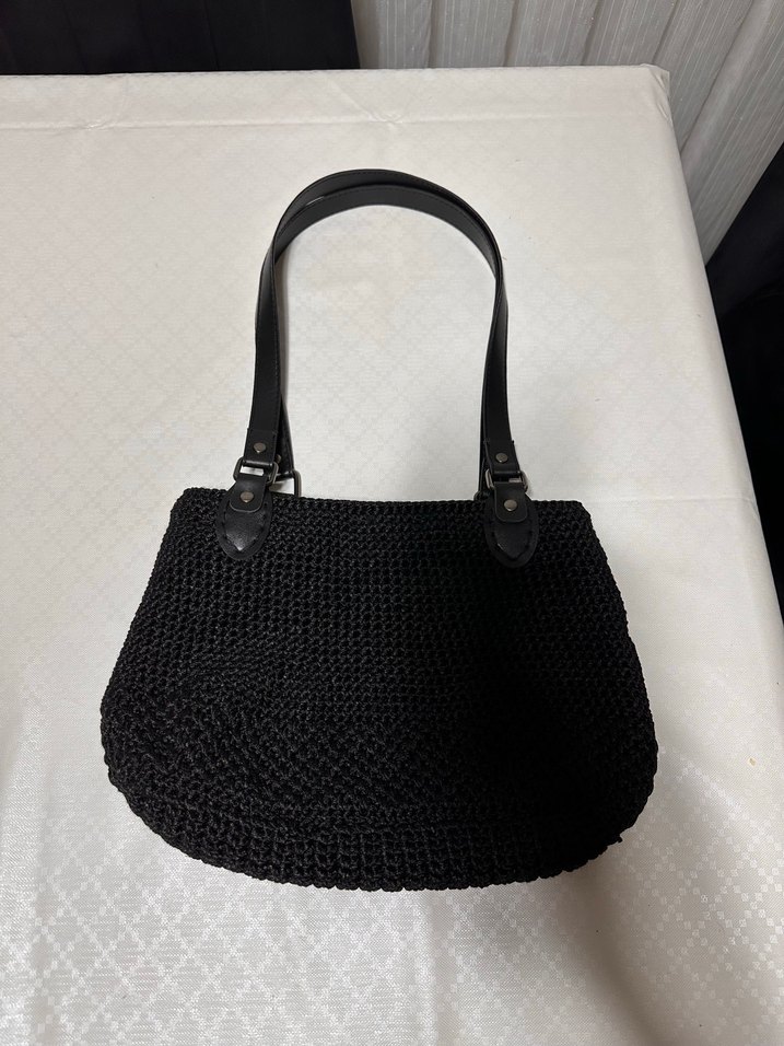 Siyah örgü kadın çanta, minimalist gotik tarzda, sağlam saplarla günlük kullanıma uygundur. Desensiz tasarımı klasik bir görünüm sunar. El örgüsü makrome ip sipariş alınır örülür