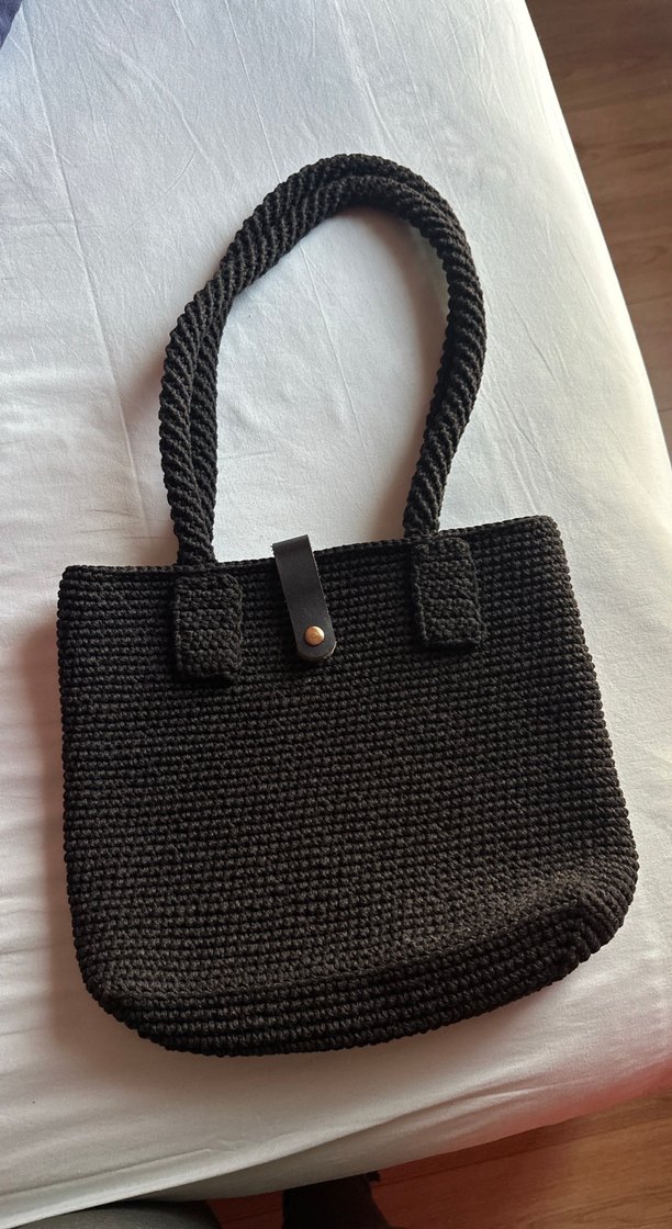 Siyah örgü kadın çanta, sade ve desensiz tasarıma sahip, sağlam saplar ve düğmeli kapama içerir, günlük kullanıma uygundur.